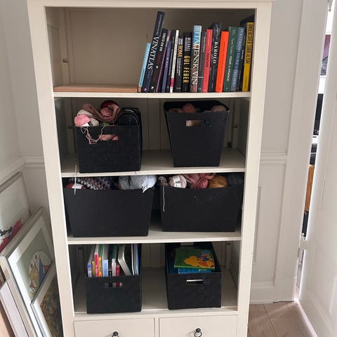 Jeg sælger denne lyseblå rustikke reol. Reolen har 4 hylder og 2 skuffer.
