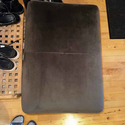 Stor mørkeblå puf i velour. Den måler 100 cm i diameter og er 40 cm høj