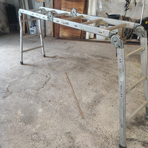 Mindre Rulle stillads i aluminium. Der er kun hvad du ser på billedet. Stilladset kan klappes sammen, så det ikke optager meget plads. Højde 160 cm, længde 185 cm og bredde 65 cm.