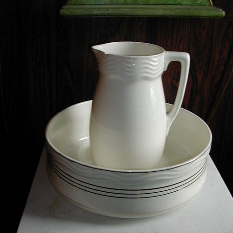 Porcelæn, Servante, Oesterreich? Paula?, Gammel servante. Lidt skrammer, se på billederne. Ved ikke om det er porcelæn eller fajance. Kande: højde 27 cm, fad højde 12 cm, fad diameter 34 cm.