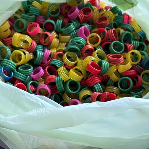 2 ruller med 10 m. 1 rulle med 15 m. Bånd og 3 ruller med 25 m. Bånd. Der er brugt ganske lidt af båndene da de primært har stået til pynt.
