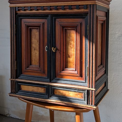 Sælger dette utroligt smukke og klassiske Vertiko-skab fra slutningen af 1800-tallet (historisme/klassicisme). Skabet er udført i mørkt, glødefyldt træ (mahogni/valnød) og fremstår med en fantastisk patina.