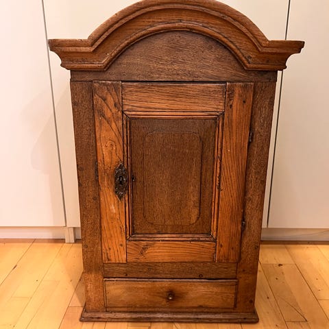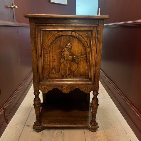 Stand: Meget velholdt antik stand med naturlige brugsspor, der vidner om møblets lange historie. Låger og skuffe fungerer upåklageligt.