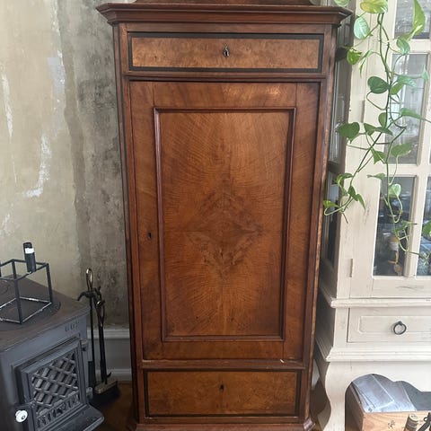 Smukt antikt Vertiko-skab i valnød/mahogni – Velholdt med flotte detaljer