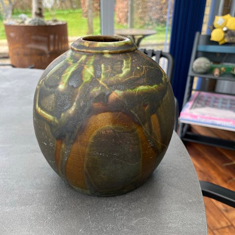 Gregers keramisk vase i brun stentøj med indgraveret signatur i bunden. Vasen har cylindrisk form med markeret hals og dekorative, reliefmønstrede felter rundt om korpus. Overfladen fremstår i nuancer af brun og beige med rustik struktur. Velegnet som dekorativ genstand eller til mindre blomsterarrangementer i hjemmet.