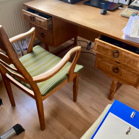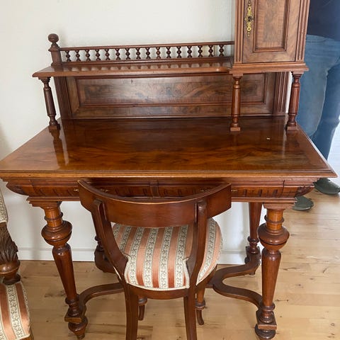 Sælger dette unikke antikke skrivebord med masser af sjæl og historie. Møblet fremstår i en flot mørk glød (sandsynligvis mahogni eller bejdset fyrretræ) og er karakteriseret ved sine flotte drejede ben og klassiske detaljer.