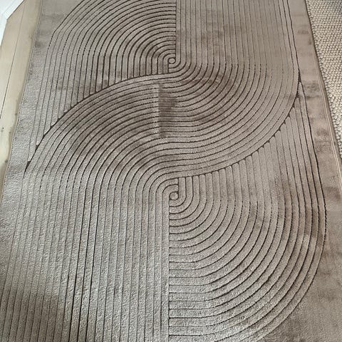 Rugvista tæppe i flerfarvet design med blandede nuancer af blandt andet grå, pink, gul og orange. Tæppet har et moderne, abstrakt mønster og rektangulær form, velegnet til placering under spisebord eller i stueområde. Materiale og præcise mål er ikke oplyst.
