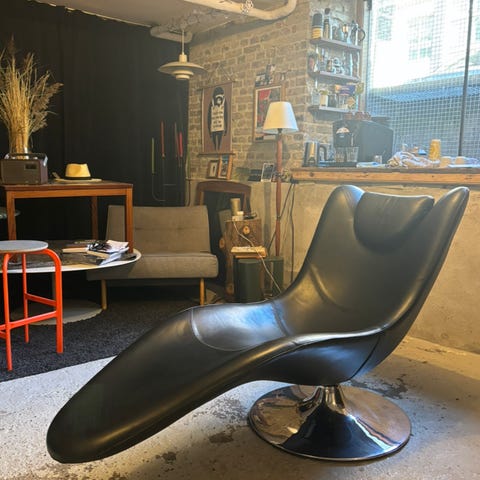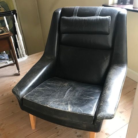 Lækker Lænestol, med forkromet metal kombineret med sort læderpolstring på sæde og ryg.
