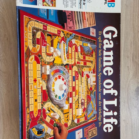 Spillet er retro fra 80’erne og indeholder spilleplade, farvede spillebrikker og terning.