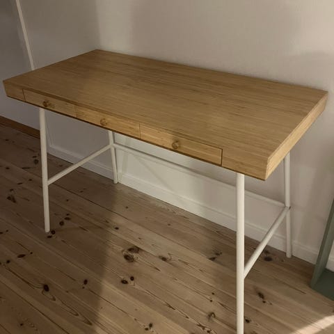 Flot og stilrent skrivebord i massivt egetræ sælges. Bordet har et enkelt, nordisk design med fine detaljer og tre praktiske skuffer til opbevaring.