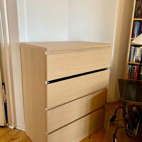 Sælger denne fine kommode med egetræslook og et enkelt, moderne udtryk. Den passer perfekt ind i både soveværelse, stue eller entré og giver et roligt, nordisk look.