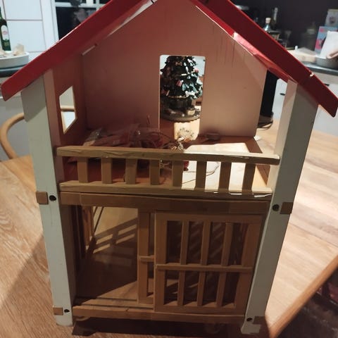 dukkehus i træ. Huset er i flere etager med åbne sider, så der er adgang til rummene fra flere vinkler. Dukkehuset står på hjul, så det er let at flytte rundt på. Indvendigt er der tapet- og gulvdetaljer i de enkelte rum. Der medfølger forskellige møbler og samt flere små dukker med tøj.