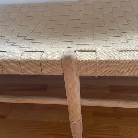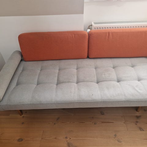 Bloomingville daybed i lysegul møbelstof med mørk bejdset ramme og ben. Stoffet er falmet flere steder og benene er lidt ustabile og trænger til en kærlig hånd..