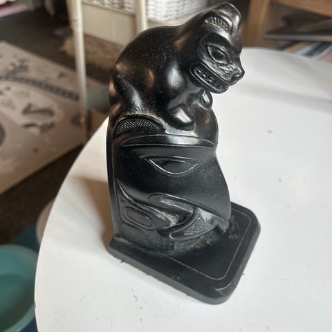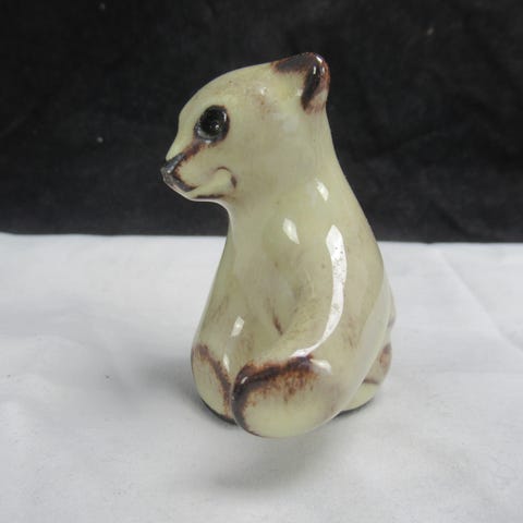 En smuk, dekorativ kattefigur med marmorlignende overflade i creme- og brune nuancer.