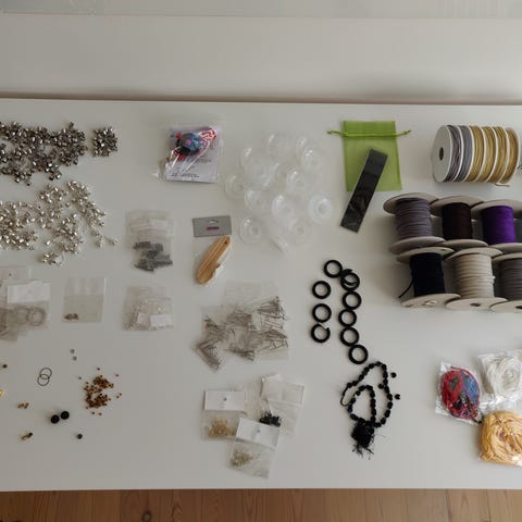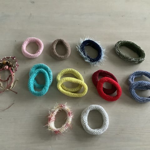 De gule og røde m/hvide og sorte er armbånd fra Pernille Bülow (kan genskabes med nyt elastik)