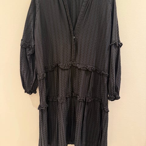 Neo Noir kjole i størrelse S. Kjolen er i blå bomuld med et småternet mønster. Overdelen har smock-elastik, som giver en tætsiddende pasform foroven, mens nederdelen har flere lag med volant-effekt. Materialet er let og struktureret bomuld, egnet til hverdagsbrug eller sommerbrug. Modellen er designet til kvinder.