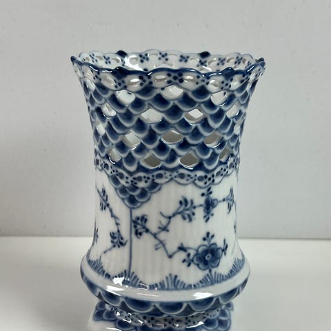 Smuk og dekorativ helblonde skål fra Royal Copenhagen i klassisk musselmalet dekoration. Udført i håndmalet porcelæn med gennemgående gennembrudt mønster, som giver et elegant og eksklusivt udtryk. Blue Fluted Full Lace / Openwork