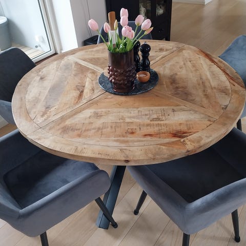 Rundt spisebord med mørk træplade og messing/ guld blankt stel. Ø 120 cm højde 75 cm. Der er flere brugs spor og afslag i pladen og på stel.