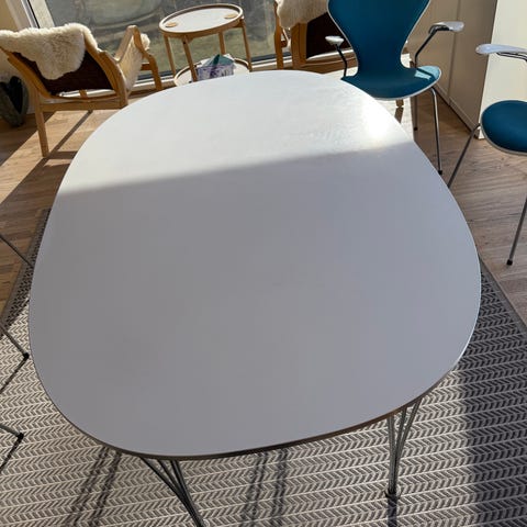 Piet Hein/Bruno Mathsson original superellipse spisebord profuceret af Fritz Hansen. Den kendte superellpse giver en afrundet rektangulære form der egner sig som spisebord eller arbejdsbord i stue eller kontor. Bordet er velegnet til flere stole og der kan sidde op til 8 mennesker til spisning omkring bordet.