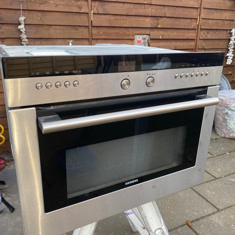 Hvem mangler en. billig og god ovn? Fungerer fint og bager jævnt. Det er en Siemens indbygningsovn med varmluft i rustfrit stål. Ovnen har mekaniske drejeknapper til valg af funktioner og temperatur, samt digitalt display. Indvendigt er der riller til bageplader og riste, og rillerne mangler et beslag, men sidder alligevel fast. Ovnen leveres med bageplader og rist som vist på billederne. Ovnen skal have fast eltilslutning og har tilslutningskabel monteret på bagsiden.