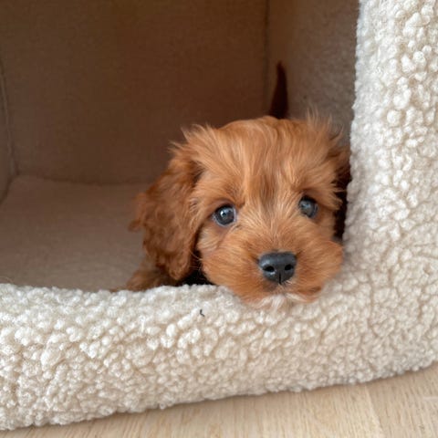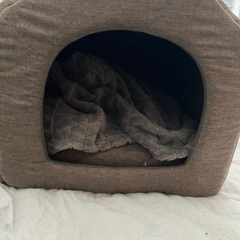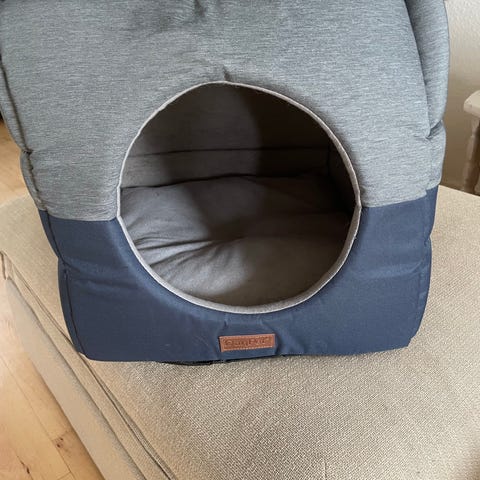 Hulen har en trekantet åbning foran og et blødt, lyst indvendigt liggeunderlag.