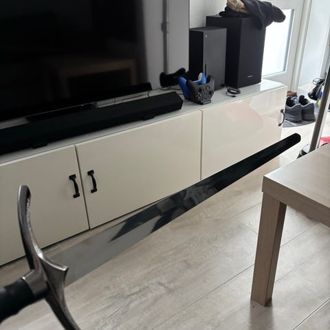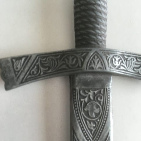 vikingesværd med tilhørende skede. Sværdet har metalgreb med ornamenterede detaljer og lige klinge i metal. Skeden er i sort materiale og dækker hele klingen. Egnet som udsmykning men også skarp og kan bruges. Der er 3 forskellige og derfor forskellige priser. Sender gerne og kan ikke bruge fix færdig fordi jeg skal sende med gls og det har fix færdig ikke.