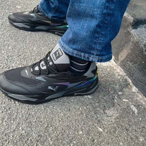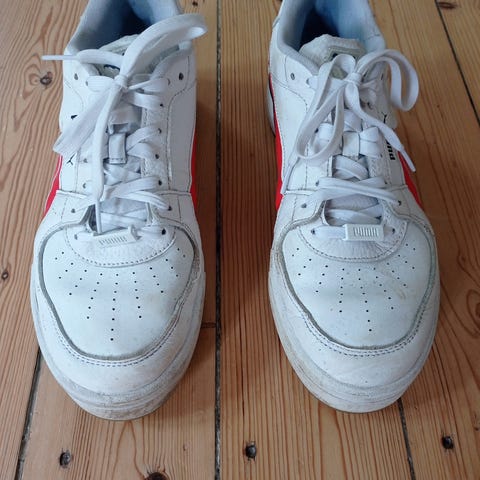 Puma sneakers i størrelse 44. Modellen er en høj sneaker med snørelukning. Skoene er i blå og hvid farve med Puma-logo på siden. Overdelen er i syntetisk materiale og tekstil med perforeringer ved tåen for ventilation. Ydersålen er i gummi, velegnet til hverdagsbrug og fritidsaktiviteter for voksne.