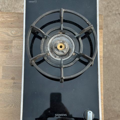 Siemens Studioline gaskogeplade fra 2016 i hårdt sort glas med fem kogezoner og riste i støbejern. Perfekt til fx kolonihaven eller sommerhuset.