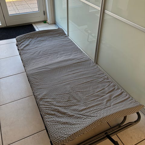 Sammenklappelig gæsteseng med springmadras. Sengen har metalstel med lamelbund og er monteret på hjul, så den kan flyttes og opbevares sammenklappet. Madrassen har et ternet betræk i mørke og lyse nuancer. Velegnet som ekstra soveplads, når den ikke er i brug kan den stå sammenklappet for at spare plads.