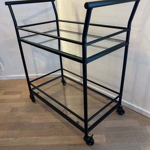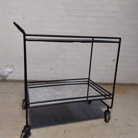 Barvogn sort metal med sorte glas plader. 2 stk haves. Der mangler en plade i bunden på den ene. Brugs ridser og lidt ledløse i stellet. Længde 63 cm bredde 42 højde 80 cm. pris pr stk.
