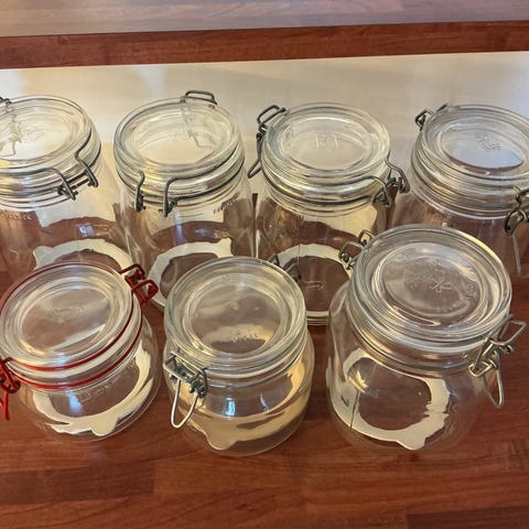 Opbevaringsglas eller sylteglas med skråt låg og fine detaljer i glasset.