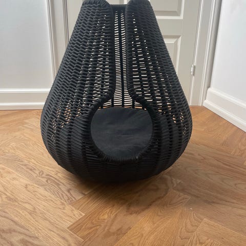 Flot dekorativ kattehule i flettet træ. Hulen er cirka 60 cm lang og 33 cm høj. Indgangen til hulen er cirka 32 cm bred og 25 cm høj. Der er ingen synlige brugsspor og fremstår i en jævn brun farve. OBS: kattehulen skal hentes I København NV, tæt på Nørrebro station.