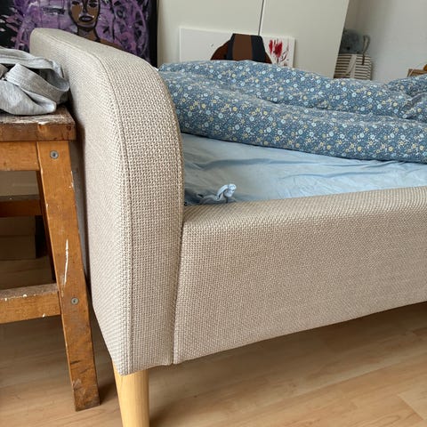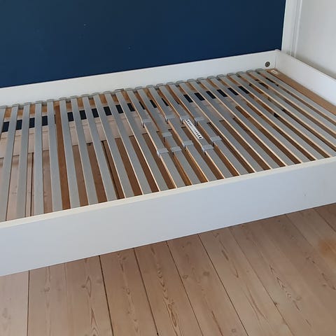 IKEA SONGESAND seng i størrelse 90x200 cm i hvid. Sengen er udstyret med IKEA LÖNSET lamelbund i størrelse 90x200 cm og IKEA VESTERÖY springmadras med pocketfjedre i størrelse 90x200 cm. Sengestel i hvidt træ/kompositmateriale med hovedgavl. Lamelbunden består af buede lameller i træ. Madrassen er en springmadras med medium fasthed og lyseblå/grå sider. Velegnet som enkeltseng til soveværelse, gæsteværelse eller børneværelse. Ny pris 2.449 kr. Sengen er skilt og står klar til afhentning.