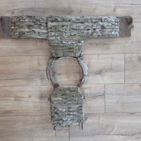 fin plate carrier brugt til hardball, der medfølger to typer cummerbund, og en quick release buckle til dem. der er små skader på den, men ingen mistet funktionalitet.