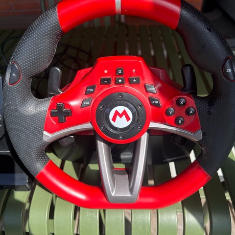 Hori Mario Kart racerrat med pedaler i rød og sort.