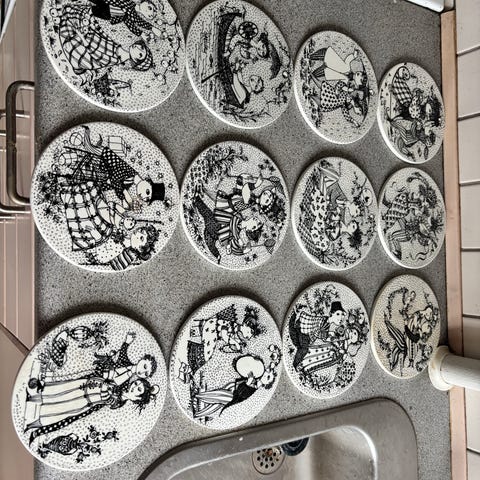 To originale Bjørn Wiinblad årstidsplatter i sort/hvid, produceret hos Nymølle / Parades Denmark. Platterne er de store udgaver (26 cm) med klassiske årstidsmotiver og fungeret både som dekorative vægplatter og samlerobjekter.