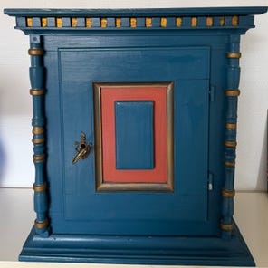 Flot grønmalet almueskab med en skuffe og et rum med hylde til ophæng af for eksempel bestik (som vist på fotoet).