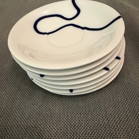 Porcelæn, Middagstallerken, frokosttallerken, underkop, kop, Royal Copenhagen, Royal Copenhagen Musica, 4 middagstallerken (2 har skår på kanten), 4 underkop, 3 kopper (1 har skår på kanten)