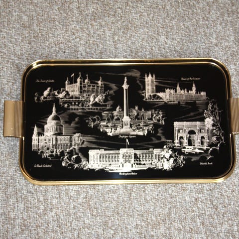 Runde bakker med blomsterdekoration. Den ene bakke har broderet blomstermotiv på stof indlagt i en metalramme. Den anden bakke har blomstermotiv på en glat, hård overflade, formentlig porcelæn eller keramik, med en kant i metal. Begge bakker er velegnede som dekorative serveringsbakker eller som underlag til små genstande i hjemmet. Sælges damlet til prisen
