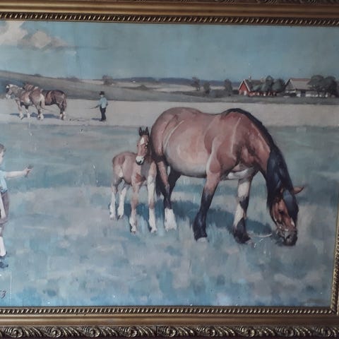 (17) Maleri m/ Heste i ramme af Edith Andersen (død 2001)