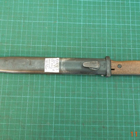 WW2 Tysk S84/98 III bajonet ved J.Sch 41 som betyder den er fremstillet af Jetter und Scheerer. Tuttlingen og den er fra 1941, den er nummerens og har en flot uslebne klinge, WaA655, den er fra marts måned i april måned i 1941, den er fra c blok. Samme år i 1941 i april måned stoppede Jetter und Scheerer deres kontrakt med Wehrmacht og dermed produktion af denne bajonet. Forsendelsen med Dao 50,- som køber betaler.