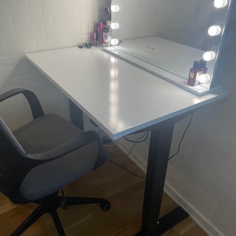 Hæve sænkeborde i lyst trælook sælges. Understel i metal med elektrisk højdejustering.