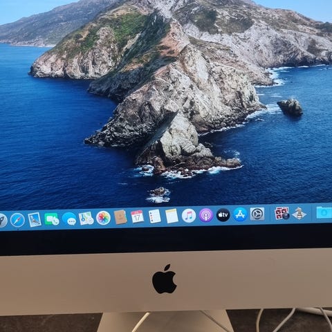 Apple iMac stationær computer. Stationær alt-i-en computer med indbygget skærm og macOS installeret. Velegnet til almindelige computeropgaver som internet, tekstbehandling og medieafspilning. Leveres med Apple tastatur som vist på billedet.