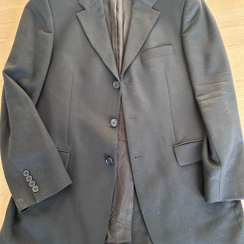 Brugt en del, men eneste brugsspor er en overfladisk flænge under kraven man ikke ser( Se billede) og et micro hul i silkeforet ved inderlomme (Se billede)