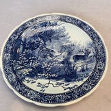 Rund porcelænstallerken med elegant blomstermotiv og detaljeret kant. Ideel til servering eller dekoration.