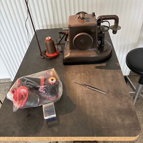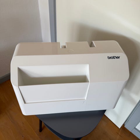 Brother industrisymaskine med fast monteret arbejdsbord og separat motor under bordet. Maskinen er beregnet til kraftigere syningsopgaver end en almindelig husholdningsmaskine og egner sig til f.eks. tekstiler, polster og lignende materialer inden for professionel eller semiprofessionel brug. Pedal og el-tilslutning er integreret i stellet, og der er monteret kontakt/bryder på siden af bordet. Maskinen står på solidt metalstel med træbordplade, som giver stabil arbejdsflade til længere syopgaver.
