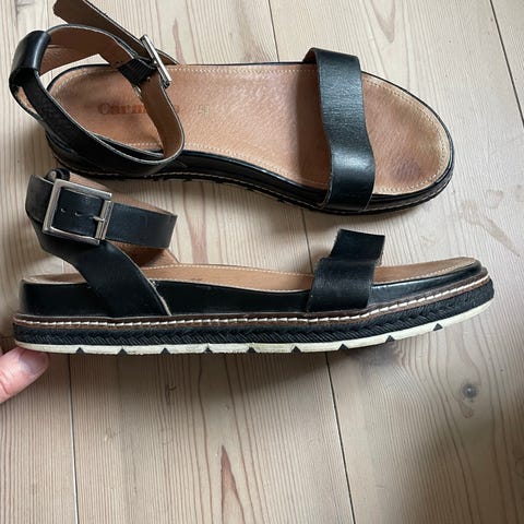 Billi Bi sandaler i sort læder i størrelse 39. Modellen har krydsremme over foden og justerbar rem om hælen med metalspænde. Indersål i læder og flad sål. Velegnet som hverdagssandal i sommerhalvåret.