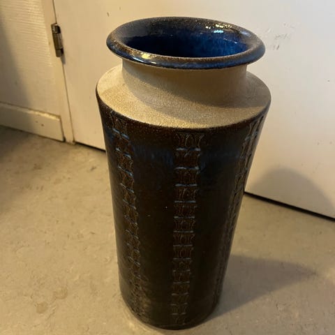 Skøn Vase af Maria Phillipi , intakt i blå / Brun Glasur, 30 cm høj, 8 cm i diameter. Nr 3181. Jeg sender med Dao eller Gls.