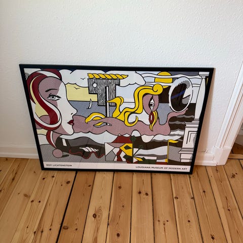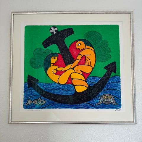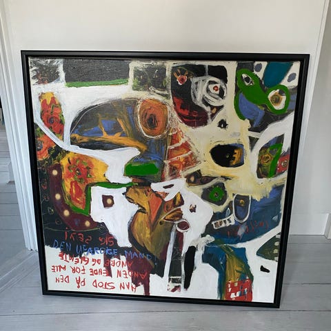 Billede med farverigt, grafisk motiv indrammet i enkel, lys ramme med glas. Motivet viser blandt andet hjerte, blomster og figurative elementer i stærke farver på grøn baggrund. Velegnet som vægdekoration i stue, kontor eller andre opholdsrum.