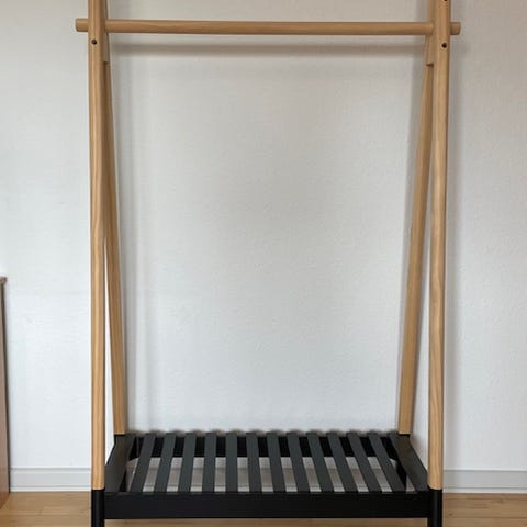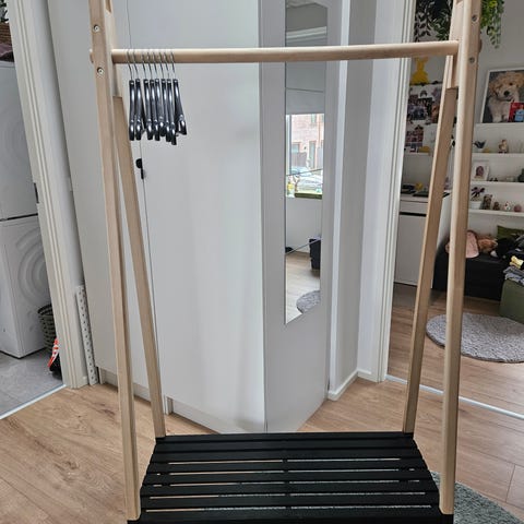 Jysk tøjstativ i træ med bøjlestang øverst og hylde nederst. Stativet er velegnet til ophængning af tøj, jakker eller skjorter, mens den nederste hylde kan bruges til opbevaring af sko, tasker eller kasser. Enkel og funktionel løsning til entre, soveværelse eller garderobe.